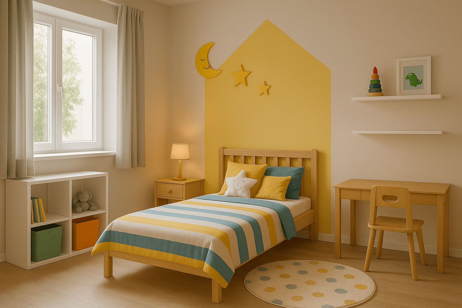 We wanted a simple and colourful room, and they nailed it! The lighting, paint shades, and playful layout make the room lively.